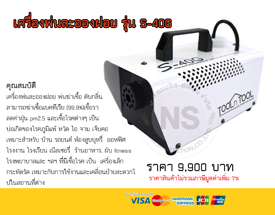คุณสมบัติ เครื่องพ่นละอองฝอย พ่นฆ่าเชื้อ ดับกลิ่น สามารถฆ่าเชื้อแบคทีเรีย (99.9%)เชื้อรา ลดค่าฝุ่น pm2.5 และเชื้อโรคต่างๆ เป็น บ่อเกิดของโรคภูมิแพ้ หวัด ไอ จาม เจ็บคอ เหมาะสำหรับ บ้าน รถยนต์ ห้องสูบบุหรี่ ออหฟิศ โรงงาน โรงเรียน เนืสเซอรี่ ร้านอาหาร. ผับ fitness โรงพยาบาลและ ฯลฯ ที่มีเชื้อโรค เป็น เครื่องเล็ก กระทัดรัด เหมาะกับการใช้งานและเคลื่อนย้ายสะดวกไ ปในสถานที่ต่าง